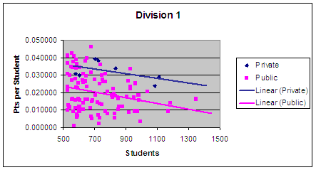 Seeing this list of schools reminded me of another study I did about a year ago. It studied whether non-public schools outperformed public schools using Harbin points as the indicator of performance. That study was done when it was rumored that the OHSAA was considering a multiplier for non-public schools which would possibly put them in a higher division. Click here to see that study in full. Generally, I found that there was some outperformance by the non-publics, but more important to this study is the fact that in Division 1, the pts per student decreased as enrollment increased. Below is a scatterplot and regression that shows this relationship: