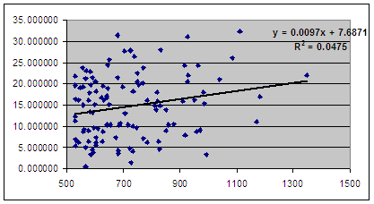 It shows that there is a general trend upward in computer points with growing enrollments. However, the r-squared value is very low, so enrollment does not explain much with regard to computer points. Compare this to the .135 r-squared score when one adds information about the public or non-public status of the school and it can be seen that pure enrollment numbers do not make for a dominant football team alone.